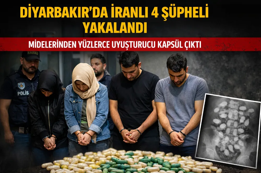 Diyarbakır’da narkotik ekipleri, İran’dan Türkiye’ye insan bedeni kullanılarak yapılan uyuşturucu sevkiyatını deşifre etti. Aralarında 2 kadının da bulunduğu 4 İran uyruklu şüpheli, yuttukları yüzlerce uyuşturucu kapsülüyle birlikte yakalandı. Zanlılar tutuklanırken, her biri hakkında 20’şer yıl hapis cezası talep edildi.